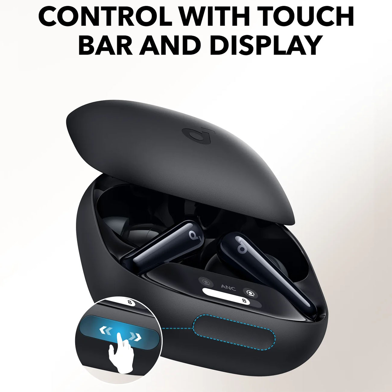– Charging case includes a small display for earbud settings control.