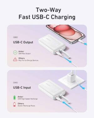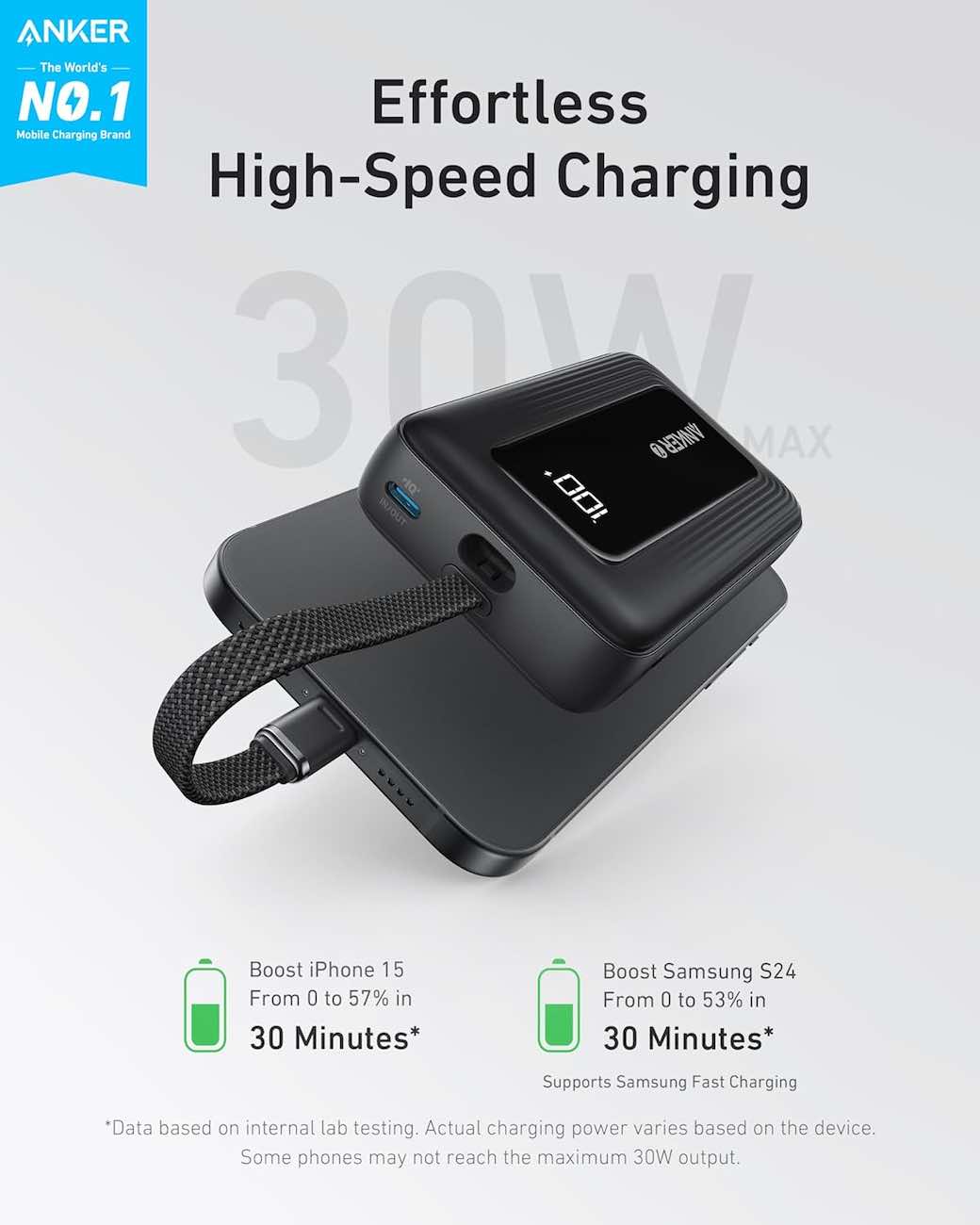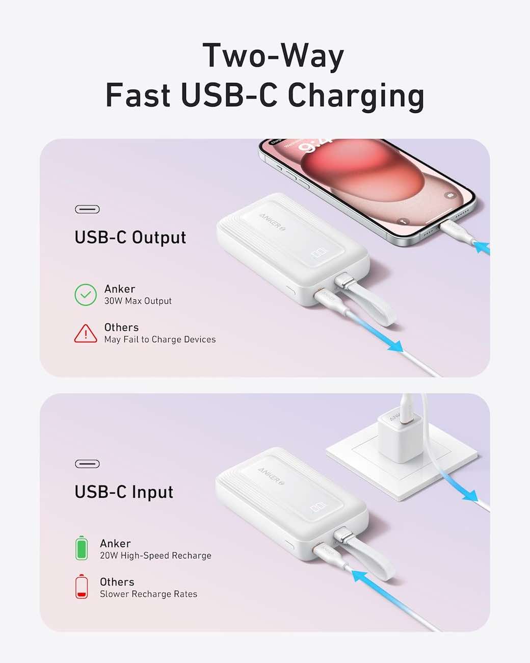 Anker Zolo 10,000 mAh Power Bank / Type-C & USB Ports / Built-in Type-C Cable / 30W Power / Black